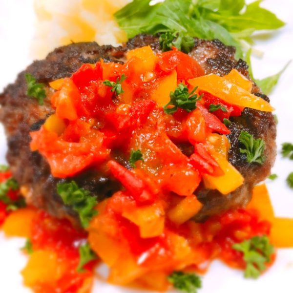 ハンバーグを焼いたフライパンに、刻んだミニトマトとパプリカと水を少し入れて煮る。