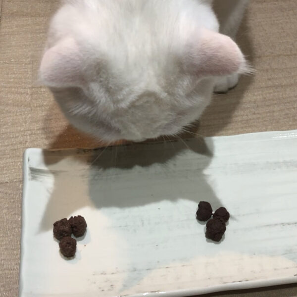 また、猫ちゃんによると思いますが、うちの子達は筋の部分等、硬くて噛み切れない物が入っているとプイッとして、食事自体を止めてしまうので、硬い筋等は下処理の際に取り除くようにしております。