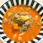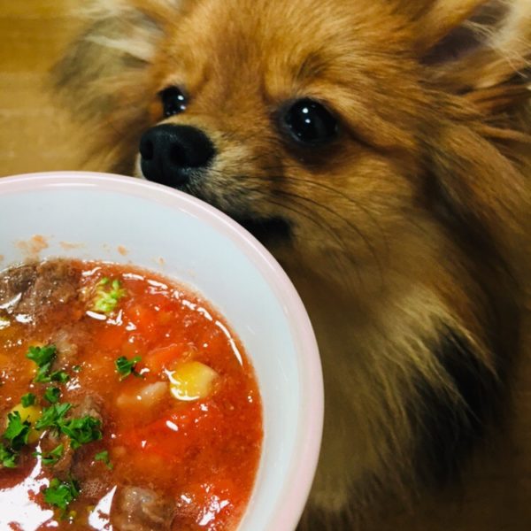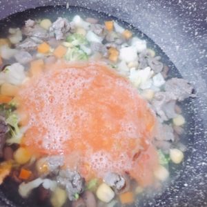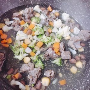 たっぷりのお湯に、茹で小豆とゆで汁、鹿肉、とうもろこし、ブロッコリー、カリフラワー、人参を入れて水分が少なくなるまで煮込み灰汁をとります。