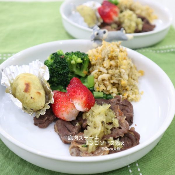 鹿肉を焼き始めるといい香りで愛犬達もソワソワし始めました。
