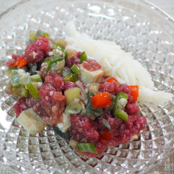 お皿に盛り付け、茹でたお素麺を添え、ごま油を垂らしたら出来上がり☆